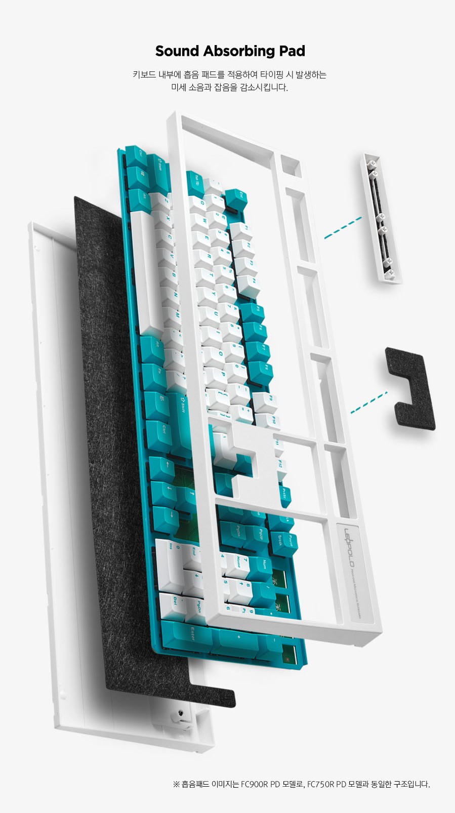 - Có miếng vải cách âm đặc biệt : những chiêc bàn phím cơ luôn có độ ồn và vang khá lớn , Leopold trang bị bên dưới bảng mạch 1 miếng vải ráp đặc biệt , có tác dụng ngăn độ vang của tiếng ồn phát ra khi gõ phím.